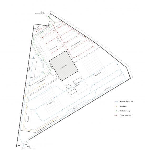 L’organisation des flux de circulation constitue un élément central du projet et détermine l’implantation du bâtiment. Son orientation le long de la rue de Neudorf permet une exploitation optimale de la géométrie de la parcelle et assure une gestion claire des déplacements. Le bâtiment joue ainsi le rôle de point d’ancrage, reliant, séparant et organisant l’ensemble des flux du site.