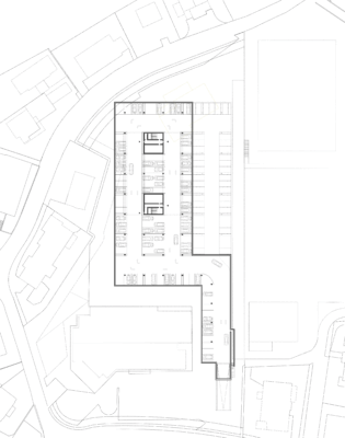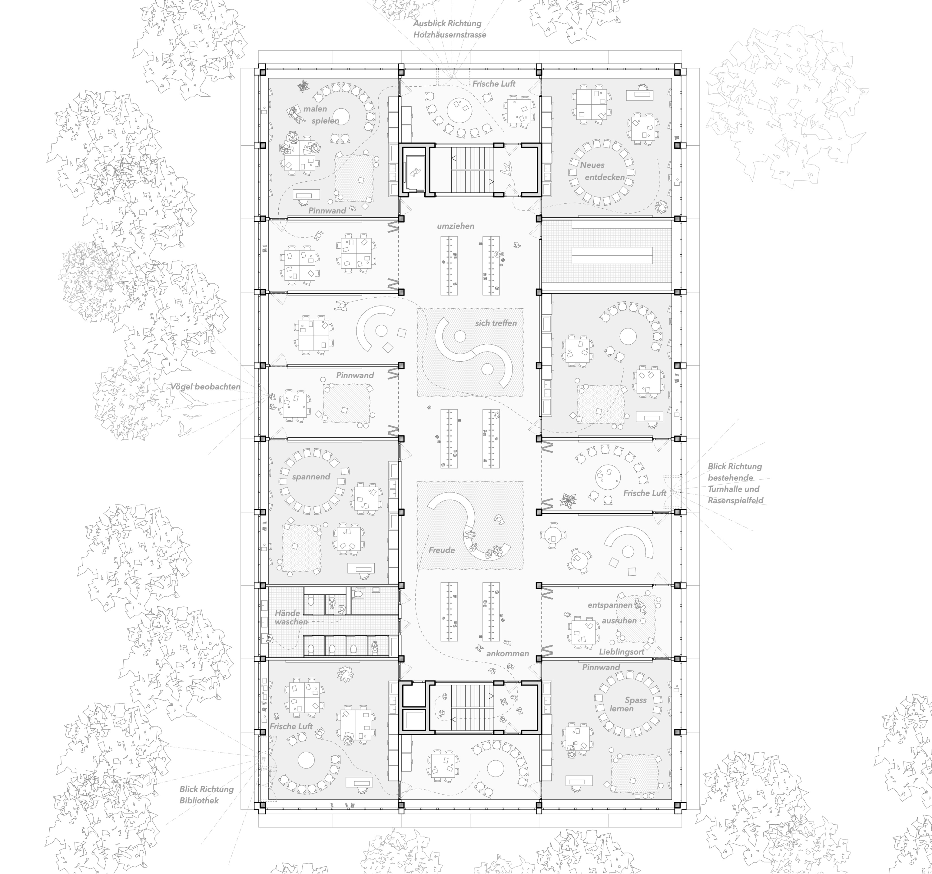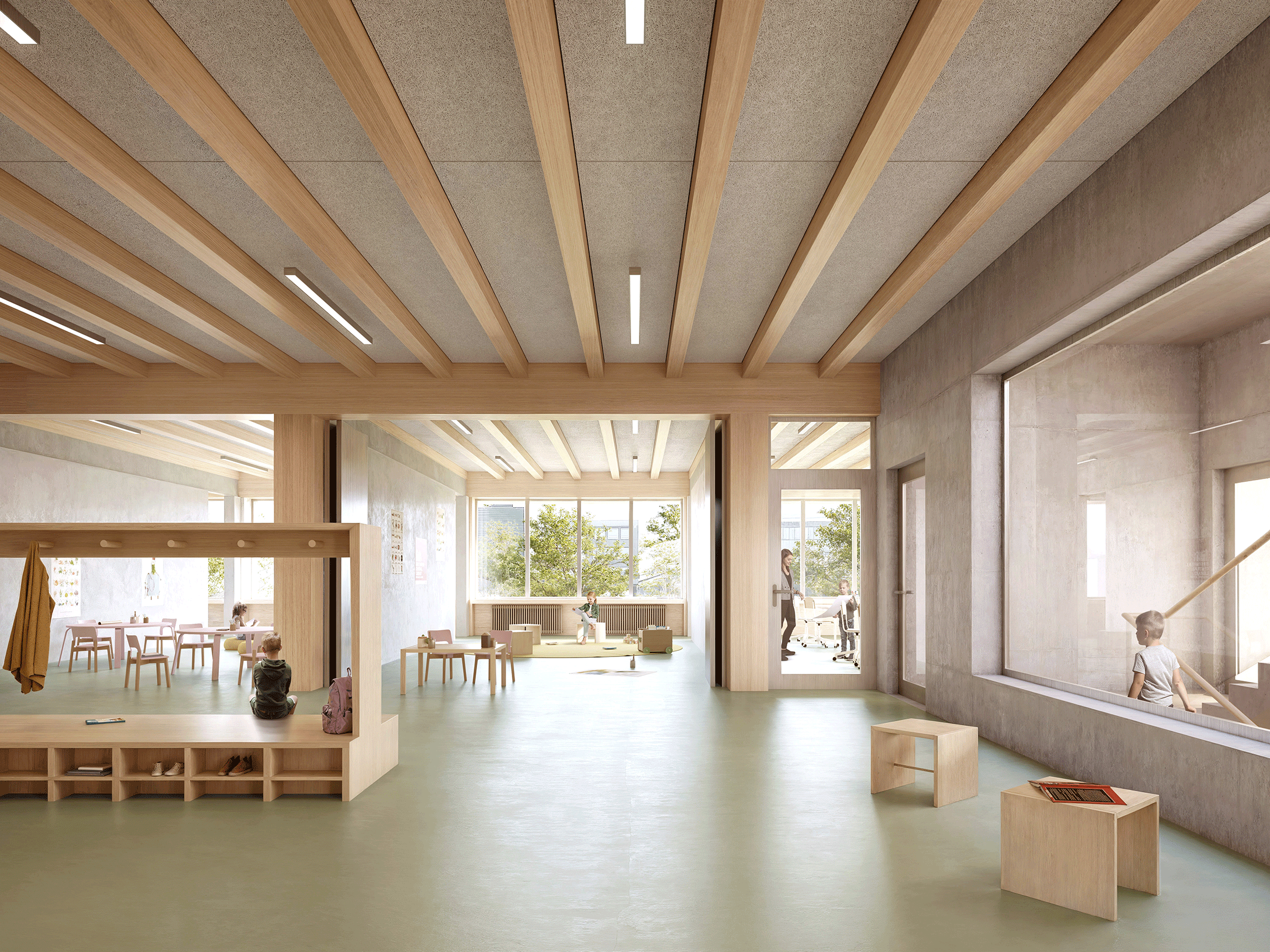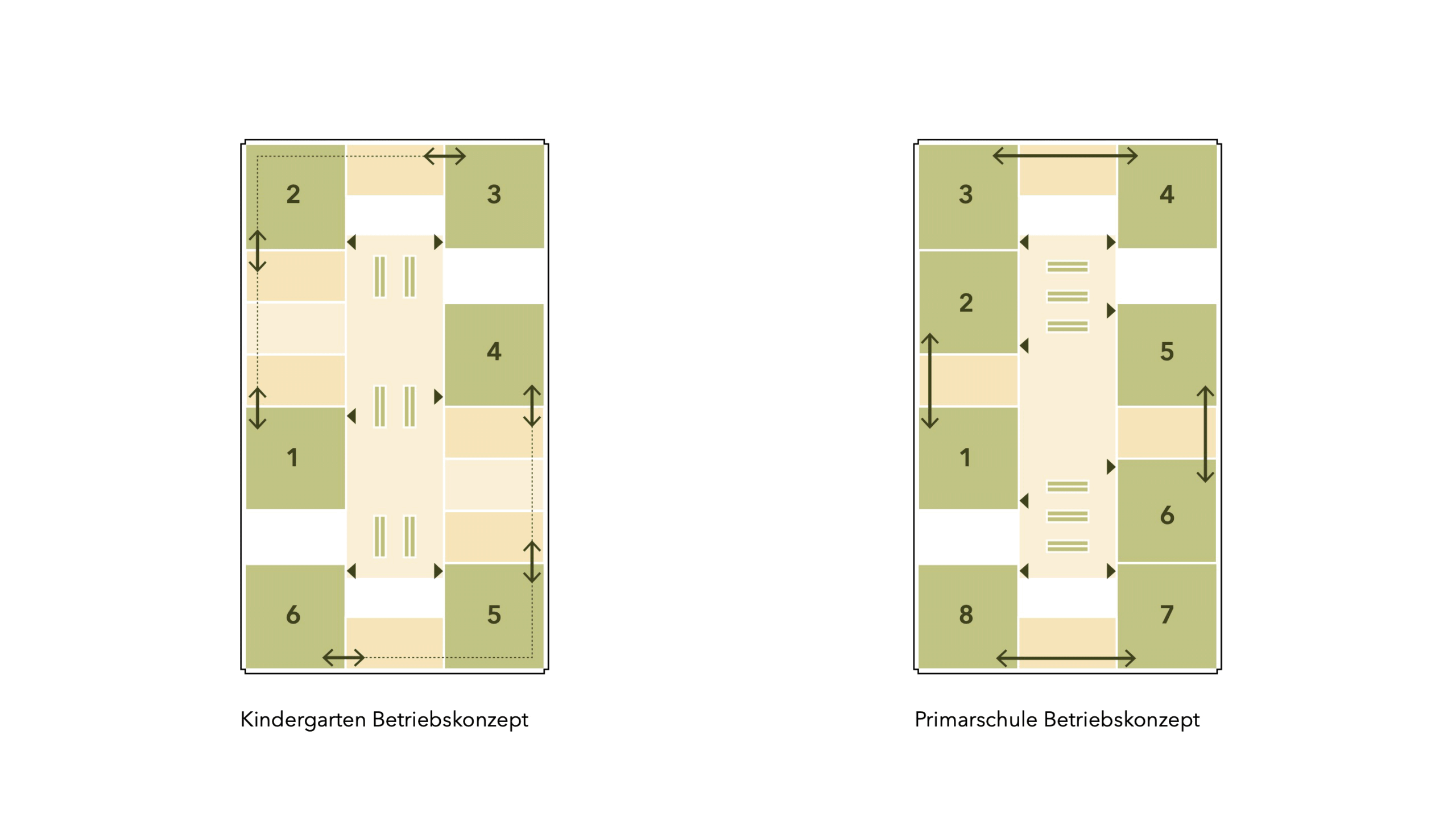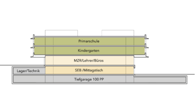 Typologisch folgt das Gebäude einem Dreitravéen-Prinzip: Die äusseren Travéen nehmen die Klassenzimmer und Aufenthaltsbereiche auf, während die mittlere Travée Erschliessung, Garderoben und Spielzonen bündelt. Das Raumprogramm umfasst ein Untergeschoss mit rund 100 Parkplätzen, ein unteres Erdgeschoss mit gemeinschaftlichen Nutzungen und Verpflegungsbereichen, ein darüberliegendes Geschoss mit pädagogischen Räumen sowie einem unabhängig nutzbaren Mehrzweckraum, ein Geschoss für die Kindergärten sowie ein oberstes Geschoss für die Primarschule.