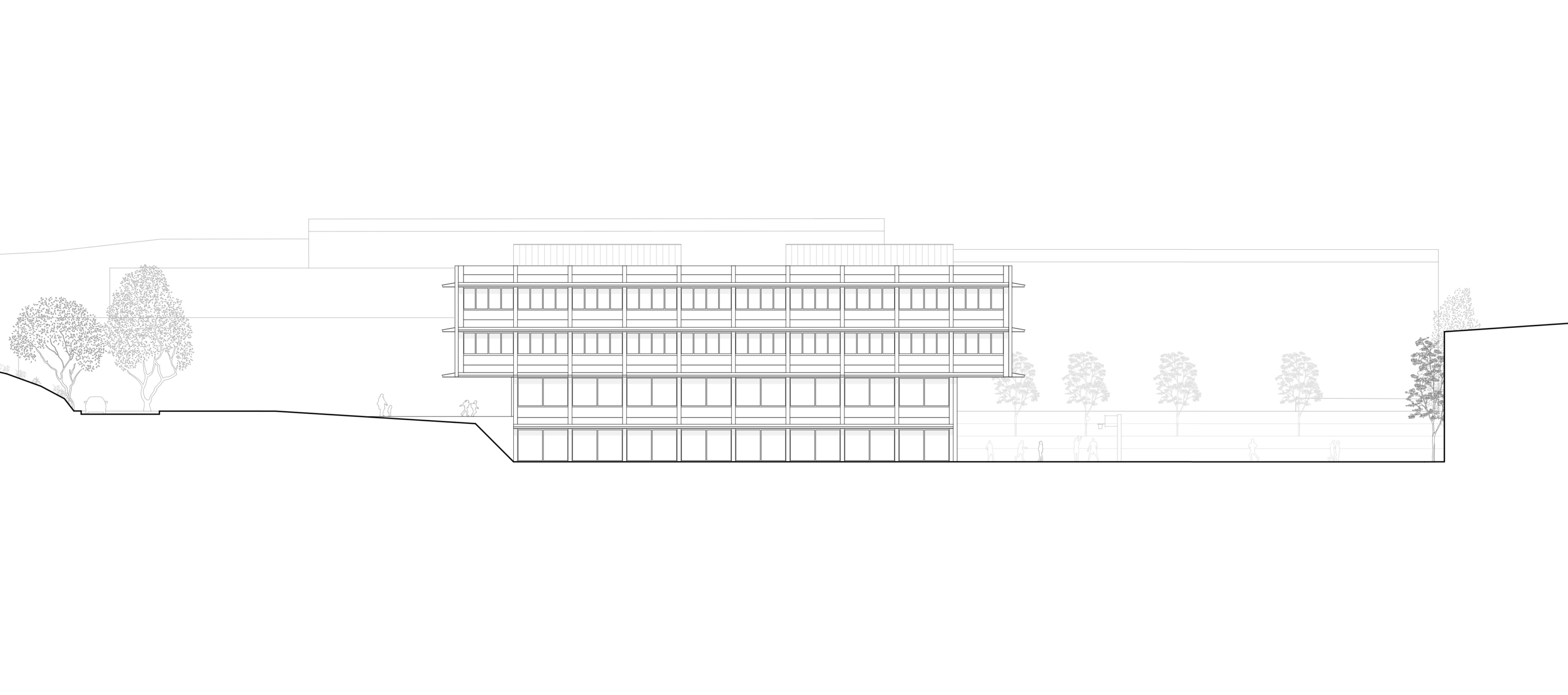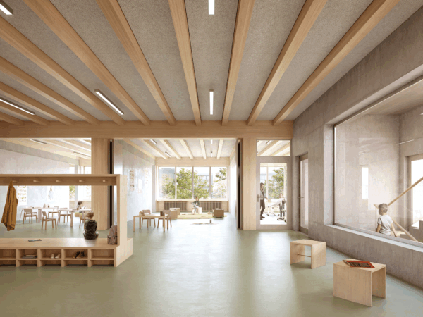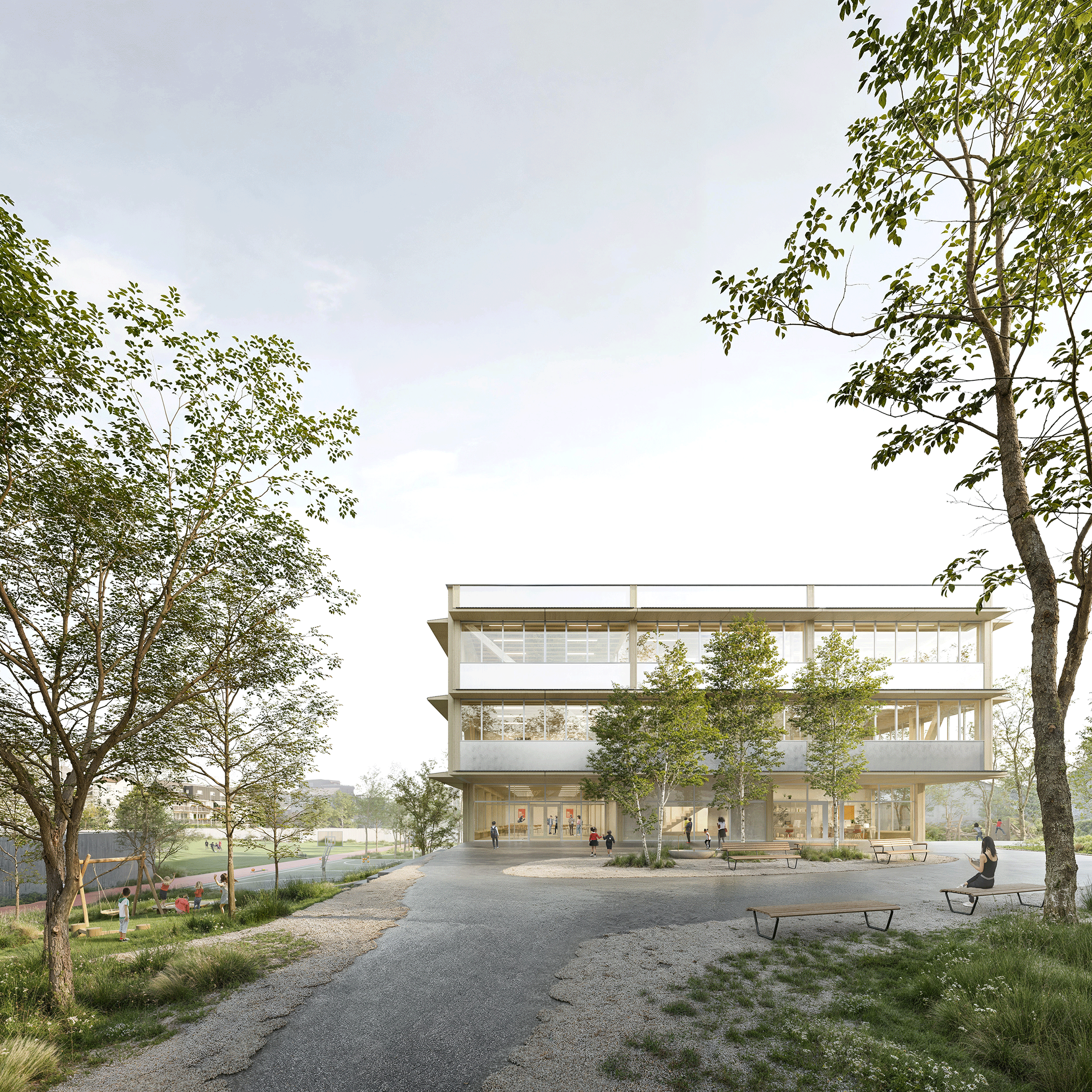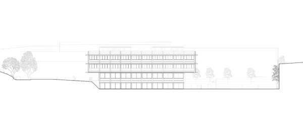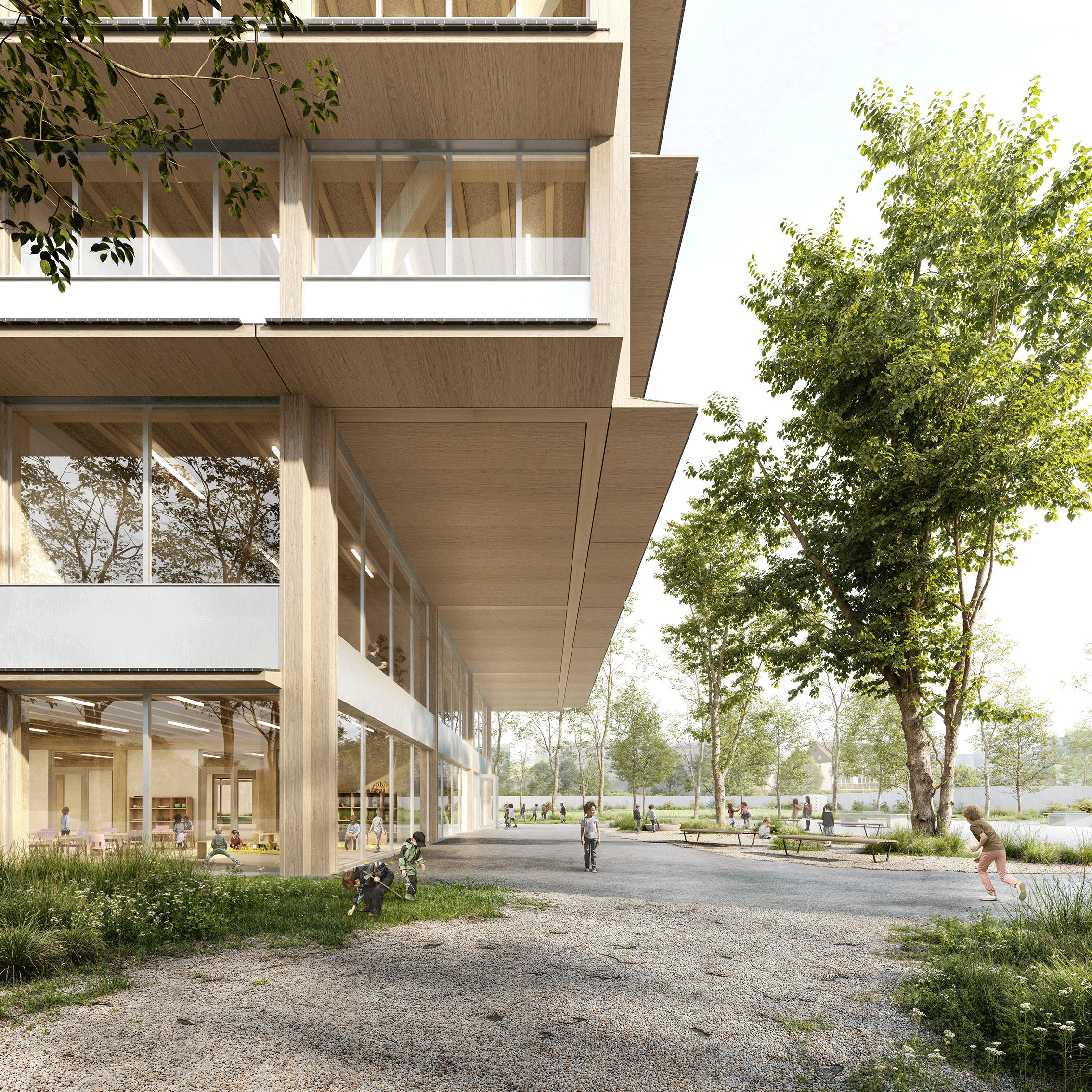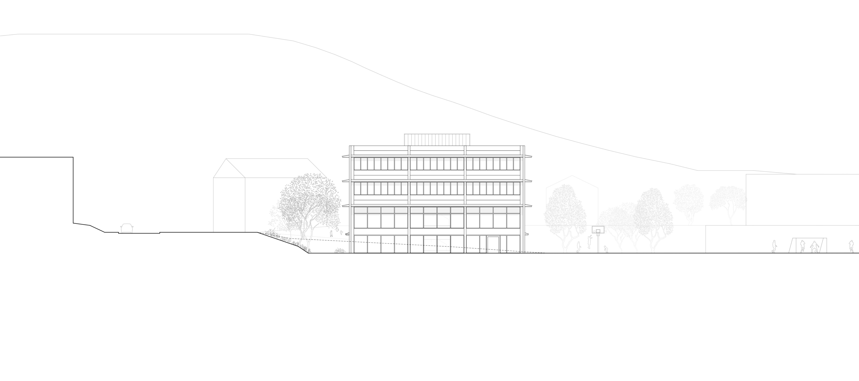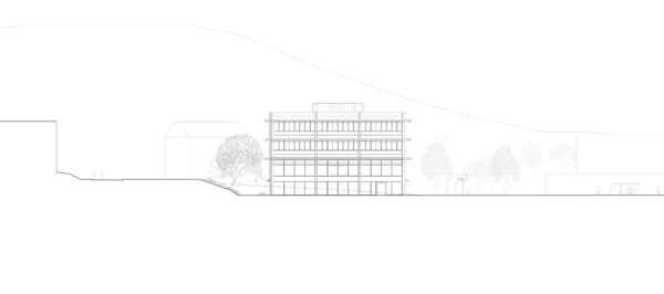 Am nordwestlichen Rand des Perimeters gelegen, öffnet der Bau den Campus über eine durchlässige Nord-Süd-Achse. Zwei versetzte Erdgeschosse bilden grosszügige und gleichwertige Zugänge. Das untere, transparente Geschoss verbindet öffentliche Nutzungen – Mensa, Mehrzweckraum und pädagogische Bereiche – mit den Aussenräumen. Darüber strukturieren zwei kompakte Unterrichtsgeschosse in Holz den Baukörper mit einer ruhigen und kohärenten horizontalen Gliederung. Die viergeschossige Volumetrie fügt sich in die Höhenentwicklung der umliegenden Gebäude ein und stärkt die Identität des Campus.
