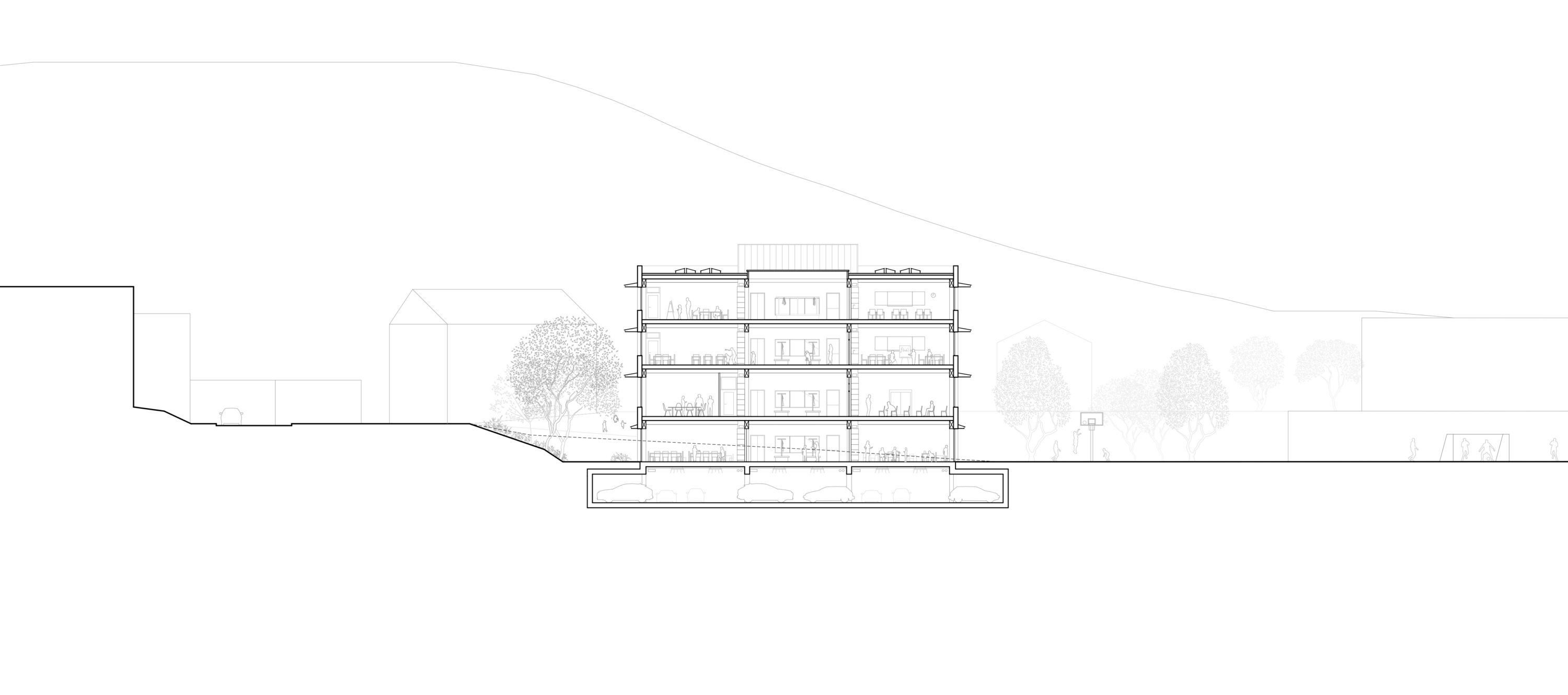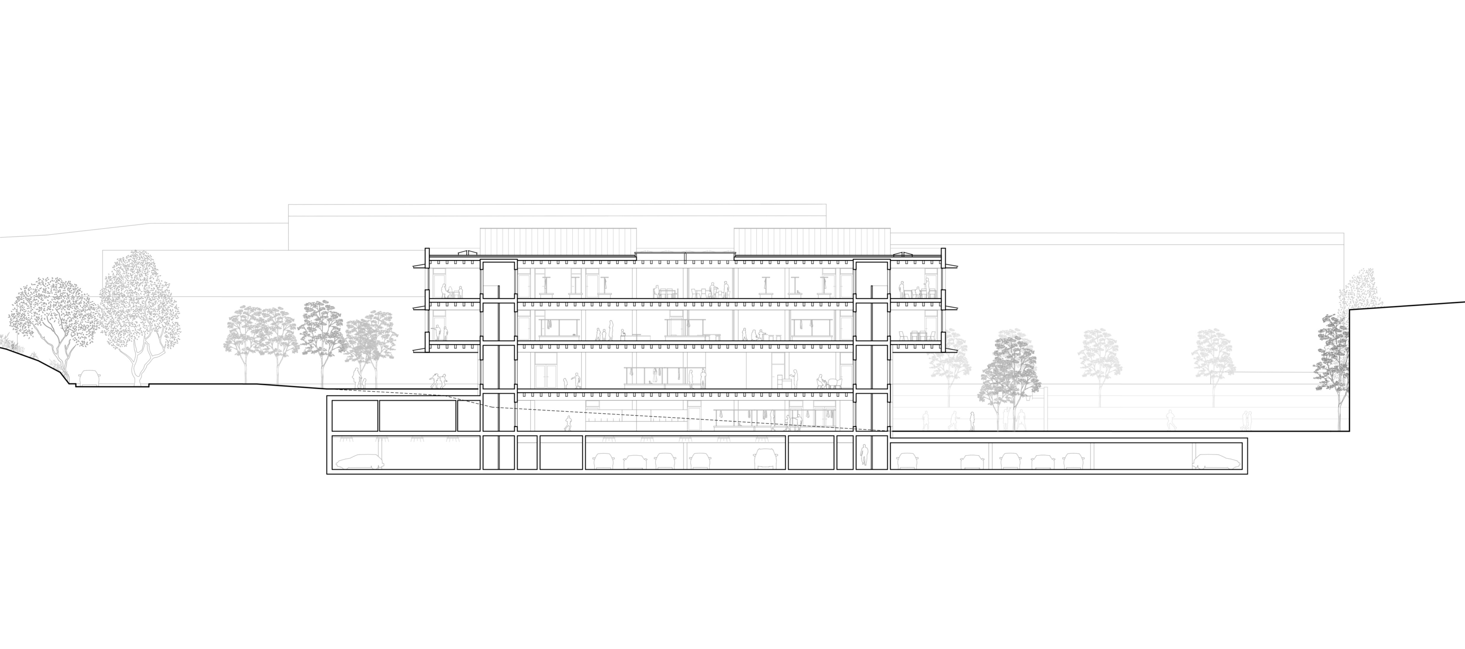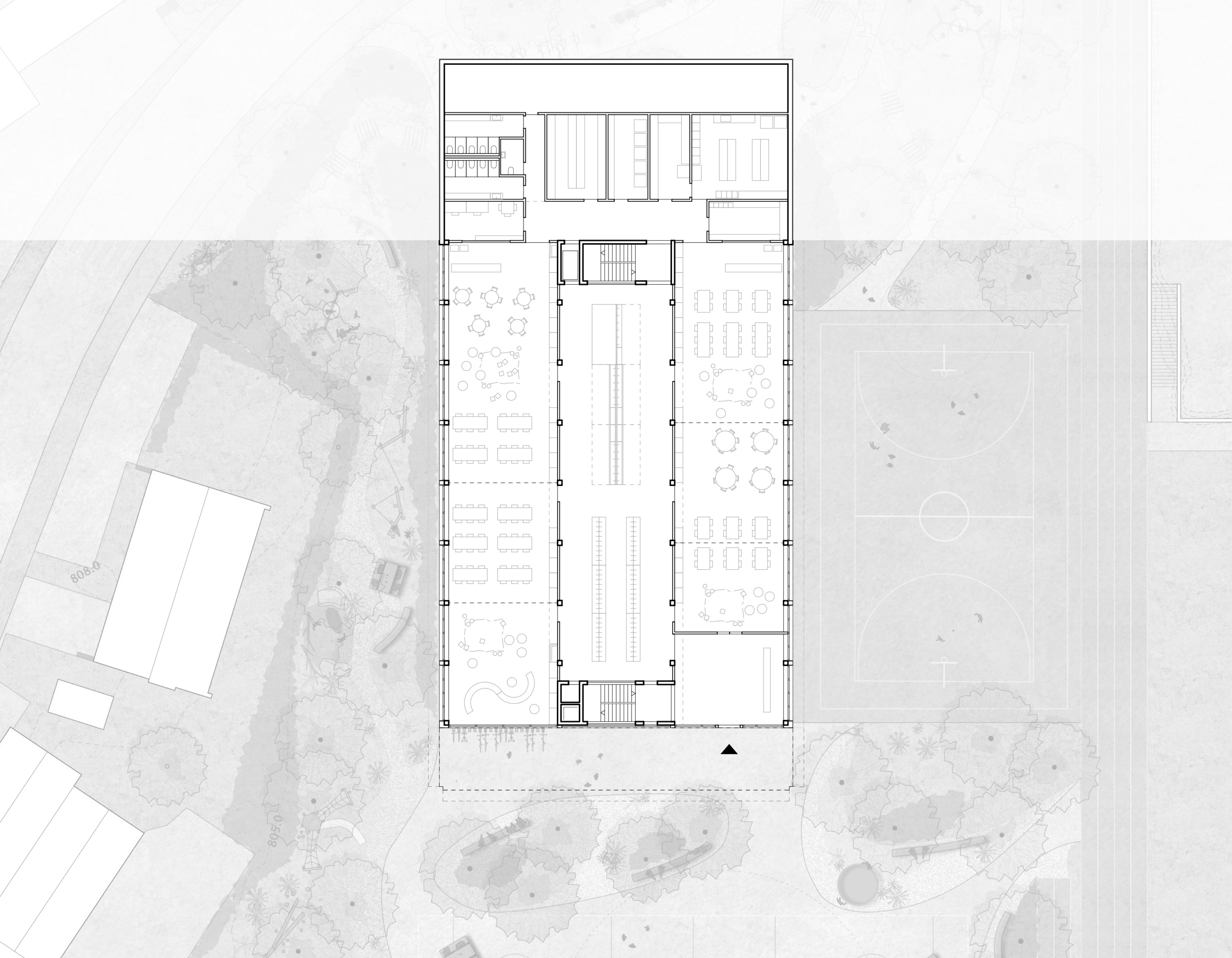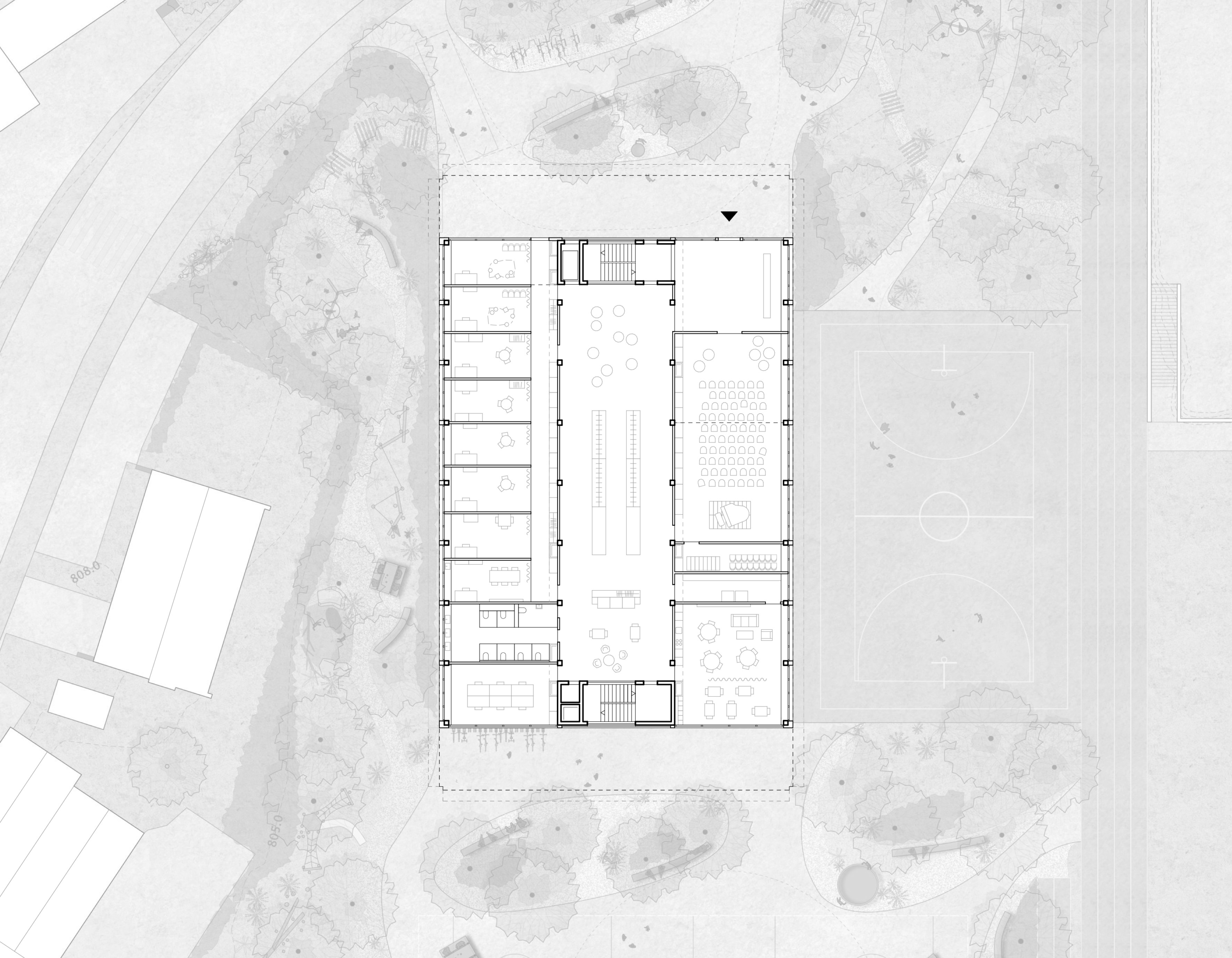 Am nordwestlichen Rand des Perimeters gelegen, öffnet der Bau den Campus über eine durchlässige Nord-Süd-Achse. Zwei versetzte Erdgeschosse bilden grosszügige und gleichwertige Zugänge. Das untere, transparente Geschoss verbindet öffentliche Nutzungen – Mensa, Mehrzweckraum und pädagogische Bereiche – mit den Aussenräumen. Darüber strukturieren zwei kompakte Unterrichtsgeschosse in Holz den Baukörper mit einer ruhigen und kohärenten horizontalen Gliederung. Die viergeschossige Volumetrie fügt sich in die Höhenentwicklung der umliegenden Gebäude ein und stärkt die Identität des Campus.