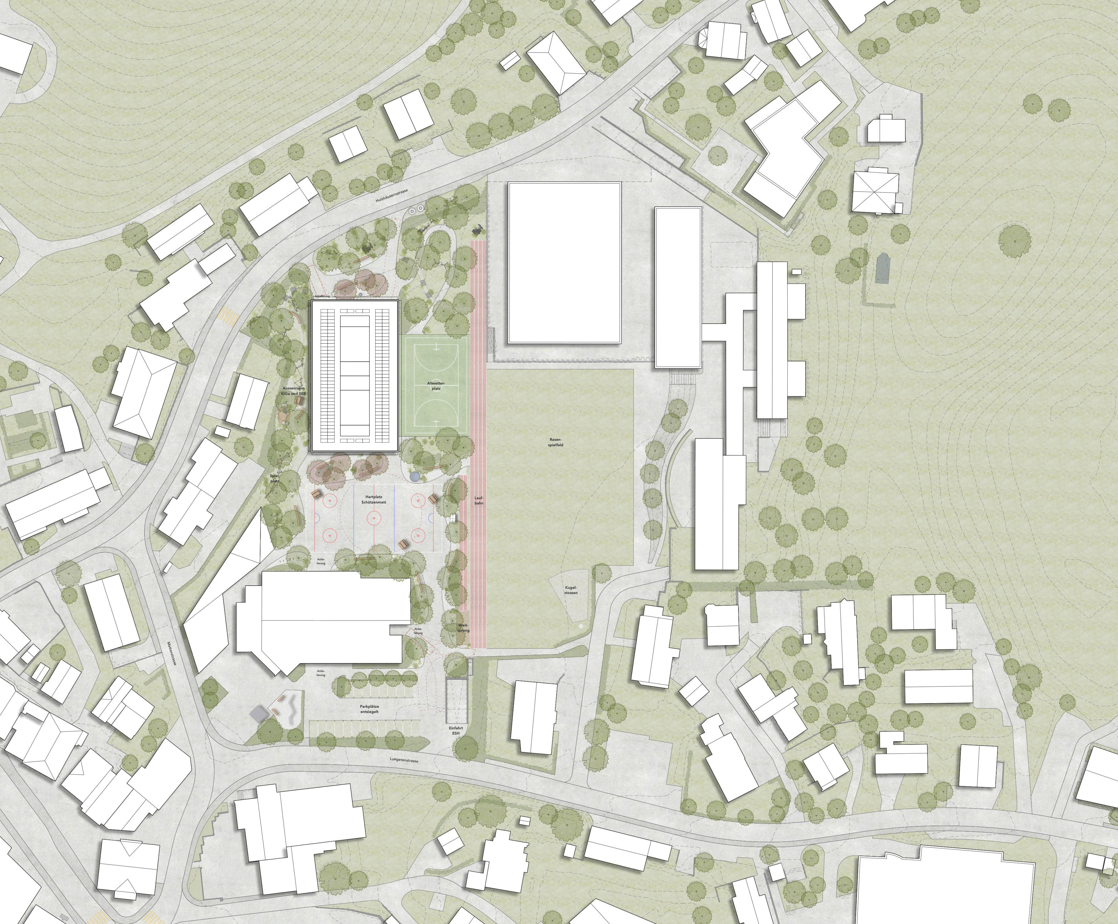 Die Freiräume zeichnen sich durch klar lesbare Eingangssituationen, einheimische Vegetation und ökologische Strukturen aus. Ein in die Topografie eingebetteter Spielbereich sowie der multifunktionale Schützenmattplatz bieten Aufenthalts-, Beobachtungs- und Veranstaltungsqualitäten. Durchlässige Beläge, Versickerungsflächen, Baumschatten und Wasserelemente tragen zur Verbesserung des Mikroklimas bei.
