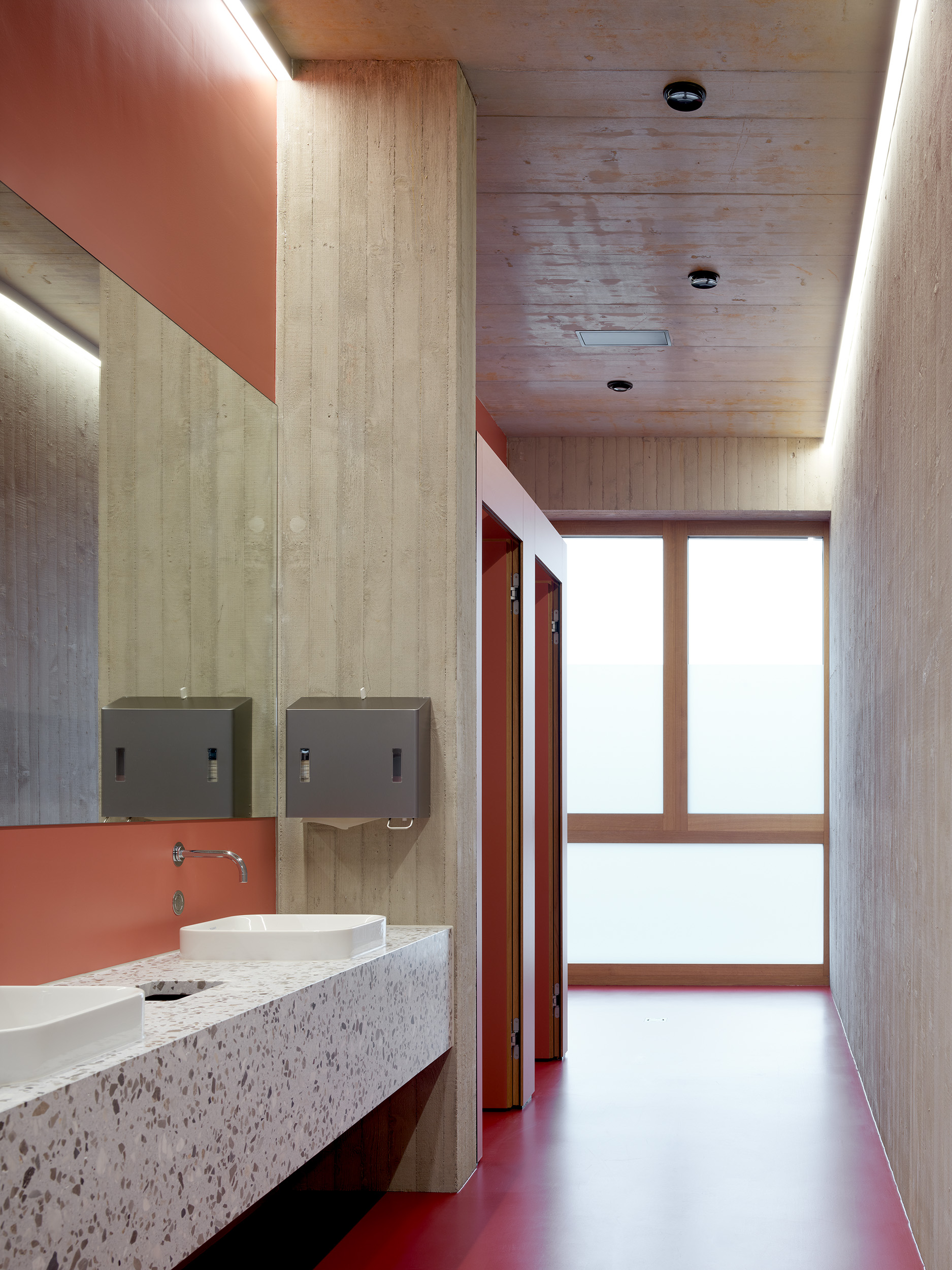 Die Schule organisiert sämtliche Unterrichtsräume in den Obergeschossen und nutzt im Erdgeschoss flexible Räume wie Musik- und Gruppenräume, die durch ein modulares System anpassbar bleiben. Das Foyer, ein zentraler, multifunktionaler Raum, definiert die innere Struktur des Gebäudes, das durch das fassadenseitige Treppenhaus ergänzt wird. Die Klassenzimmer sind in der Gebäudeecke mit Doppelbelichtung angeordnet. Die Gruppenräume sind mit den Klassenzimmern funktional verbunden und mit raumhohen Falttüren ausgestattet, welche die Schaltbarkeit zum anschließenden Foyer ermöglichen. Der Kindergarten im Annexbau des Erdgeschosses bildet drei eigenständige Einheiten mit gemeinsamer Halle und vielfältigen räumlichen Beziehungen.